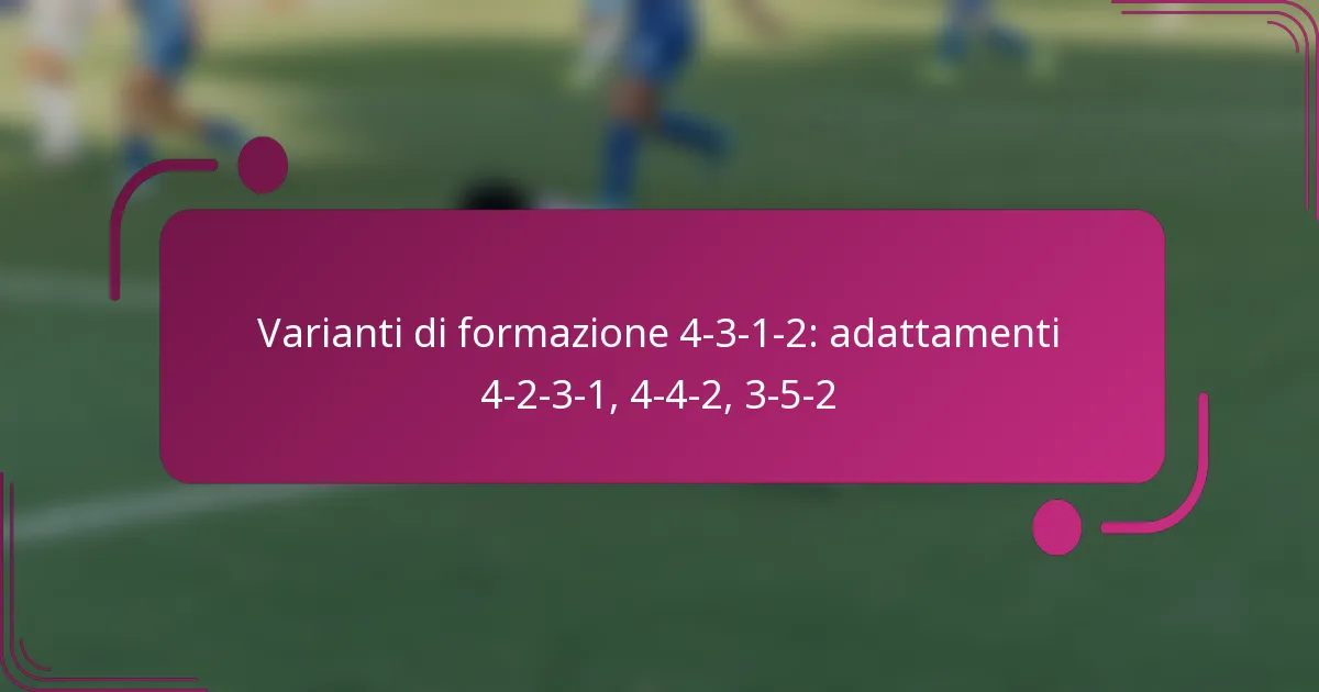 La formazione 4-3-1-2 funge da impostazione tattica versatile nel calcio, bilanciando la forza difensiva con opzioni offensive. Varianti come il 4-2-3-1 e il 4-4-2 adattano questa formazione per migliorare il controllo del centrocampo e fornire maggiore flessibilità offensiva, mentre il 3-5-2 offre un approccio diverso utilizzando i terzini per allargare il gioco. Ogni adattamento consente alle squadre di personalizzare le proprie strategie in base ai punti di forza dei giocatori e alle situazioni di partita.